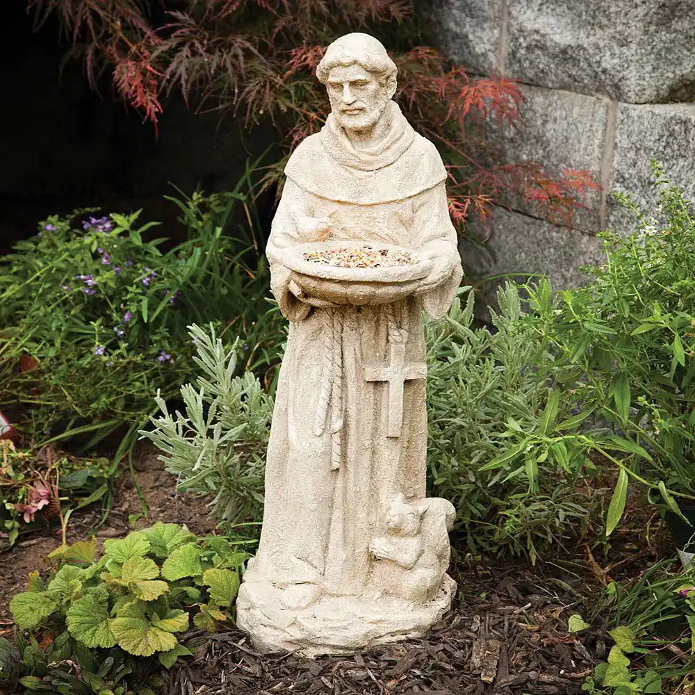 A great addition to any garden or yard, our St. Francis bird feeder statue captures the warmth and compassionate nature of the saint and immortalizes his love for his feathered and furry friends. Sprinkle some seed into the bowl in St. Francis’s hand and it will attract colorful birds of all sizes to your garden. Made of durable polyresin and finished with a distressed look to last indefinitely outdoors. Measures 26″ tall.